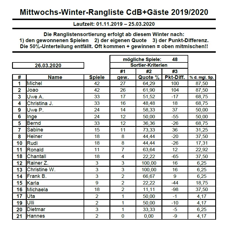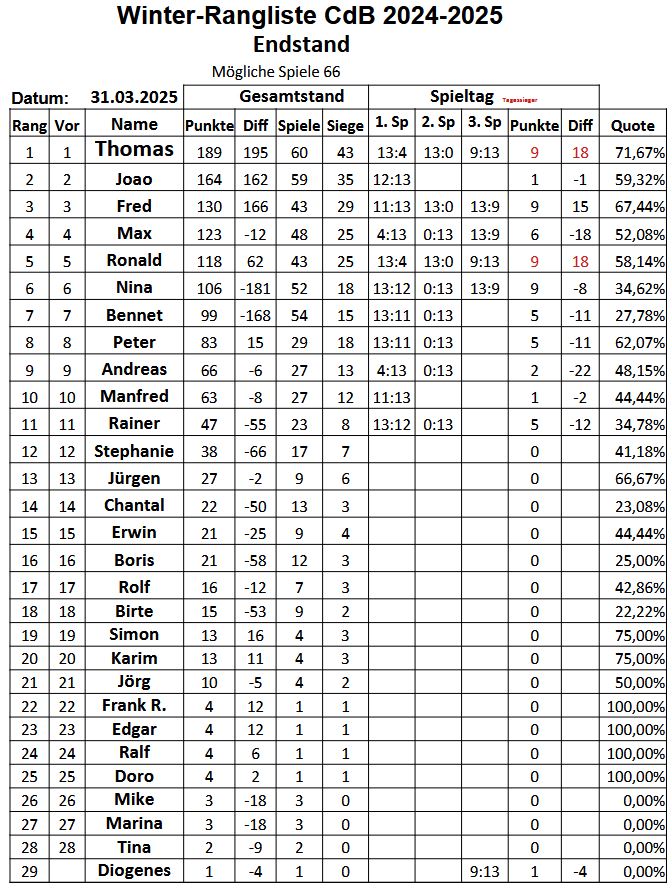 Die Winterrangliste ist beendet und wurde souverän von Fred gewonnen, der während der gesamten Zeit lediglich drei Spiele verloren hat – eine Super-Leistung! Herzlichen Glückwunsch! Gefolgt von Thomas, der endlich einmal nicht die Rangliste gewonnen hat.